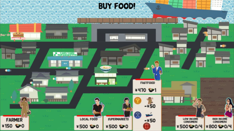 Digitalizing the game enabled us to make the game feel more alive. All the actions players take are represented on screen; for every food item the local restaurant buys from the farmer, a truck is dispatched to the farm to pick up the shipment and transport it back to the restaurant. When the fast food chain imports goods a truck drives to the docks where an oddly fast container ship dumps an array of crates to be picked up by the chains transport truck. In the event that not all consumers get fed, characters get shot out of the district and roll around to represent the loss of civilians.